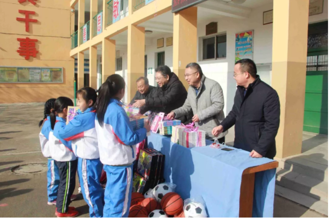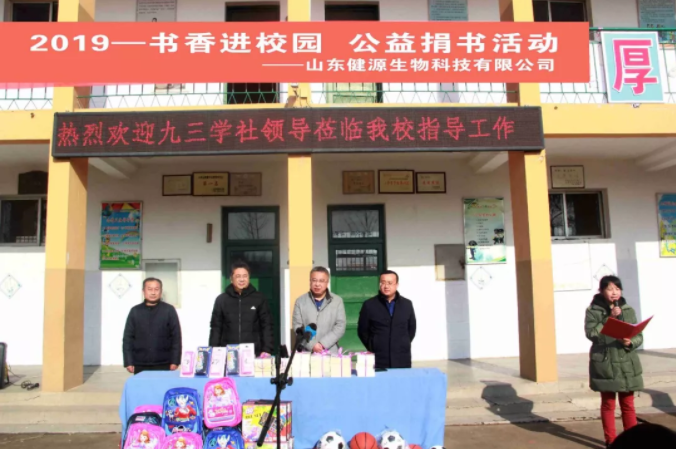 一本書傳遞一份愛,一份愛成就一個(gè)夢想,一個(gè)夢想讓無限希望起航,愛心就像一個(gè)蒲公英,和著暖陽來到了校園。元旦將至,歲寒情深,2019年12月27日,九三學(xué)社與山東健源生物科技有限公司共同為泰安市高新區(qū)化馬灣小學(xué)捐贈了一批書籍、學(xué)習(xí)用品和體育器材,為學(xué)生和老師們送去社會的關(guān)心、關(guān)懷和關(guān)愛。