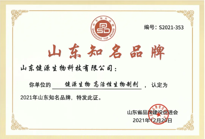 熱烈祝賀山東健源生物“健源生物高活性生物制劑”被認(rèn)定為山東知名品牌