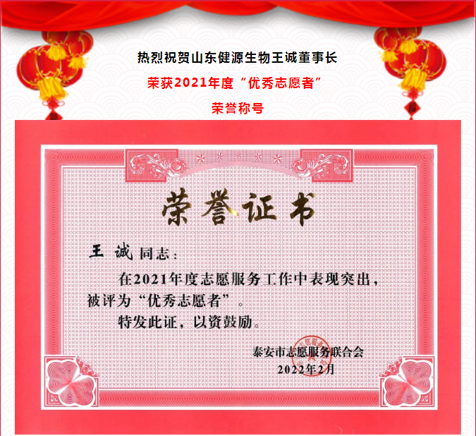 熱烈祝賀山東健源生物王誠(chéng)董事長(zhǎng)榮獲2021年度“志愿者”榮譽(yù)稱號(hào)