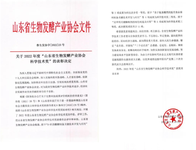 按照《山東省生物發酵產業協會科學技術獎獎勵章程》相關規定,開展2022年度山東省生物發酵產業協會科學技術獎的申報、評審工作,經山東省生物發酵產業協會科學技術獎勵委員會評審和審核,山東省生物發酵產業協會批準,授予山東健源生物科技有限公司成果為科技進步獎一等獎。