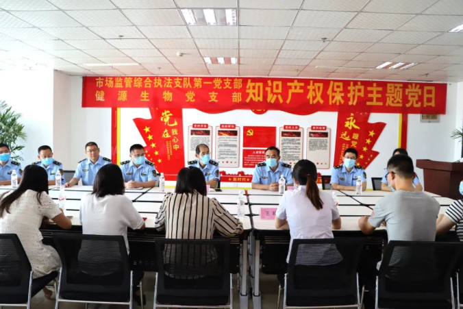服務(wù)經(jīng)濟發(fā)展,賦能強市建設(shè)。2022年9月2日,山東健源生物黨支部與泰安市市場監(jiān)管綜合執(zhí)法支隊黨支部聯(lián)合開展"知識產(chǎn)權(quán)保護主題黨日"活動,增強企業(yè)知識產(chǎn)權(quán)保護意識。泰安市市場監(jiān)管綜合執(zhí)法支隊副支隊長孫鳳明、任常平帶領(lǐng)第一支部12名黨員參加,山東健源生物行政副總經(jīng)理王玲、技術(shù)研發(fā)部主任董桂紅等相關(guān)部門負責人一同參與活動。