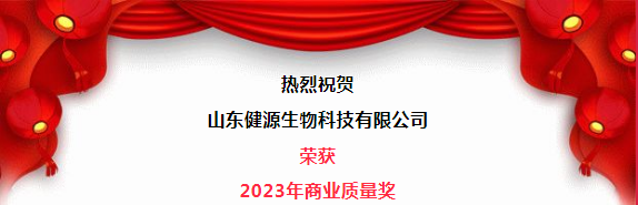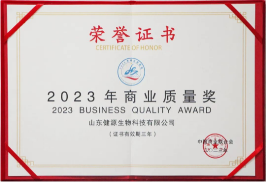 2023年7月30日,由中國商業聯合會主辦的“2023年全國商業科技質量大會”在北京隆重召開,會議聚焦商業科技創新和高質量發展。大會現場頒發了第十六屆中國商業聯合會商業質量獎。經商業質量獎評審辦公室初步形式審查,組織專家評審及獲獎名單公示,決定授予98家單位“第十六屆商業質量獎”,山東健源生物科技有限公司榮獲“2023年商業質量獎"。