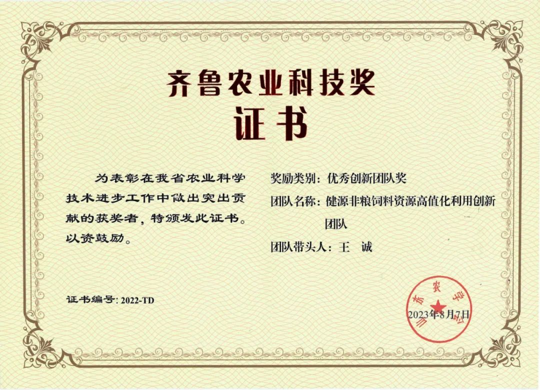 由山東健源生物有限公司董事長王誠作為團隊帶頭人,帶隊的“健源非糧飼料資源高值化利用創(chuàng)新團隊”榮獲2022年度齊魯農(nóng)業(yè)科技獎優(yōu)秀創(chuàng)新團隊獎。
