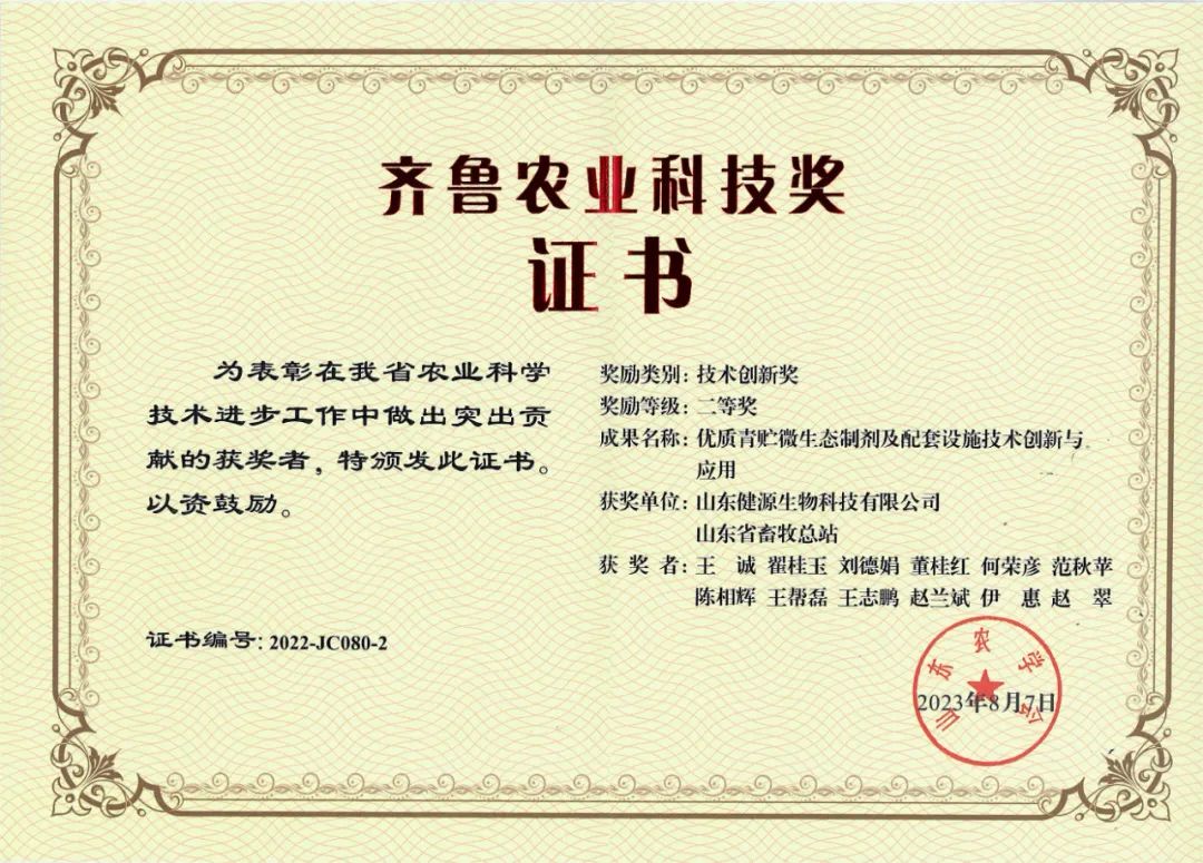 山東健源生物科技有限公司作為第一完成單位申報的“優(yōu)質(zhì)青貯微生態(tài)制劑及配套設(shè)施技術(shù)創(chuàng)新與應(yīng)用”項目榮獲2022年度齊魯農(nóng)業(yè)科技獎技術(shù)創(chuàng)新獎二等獎。