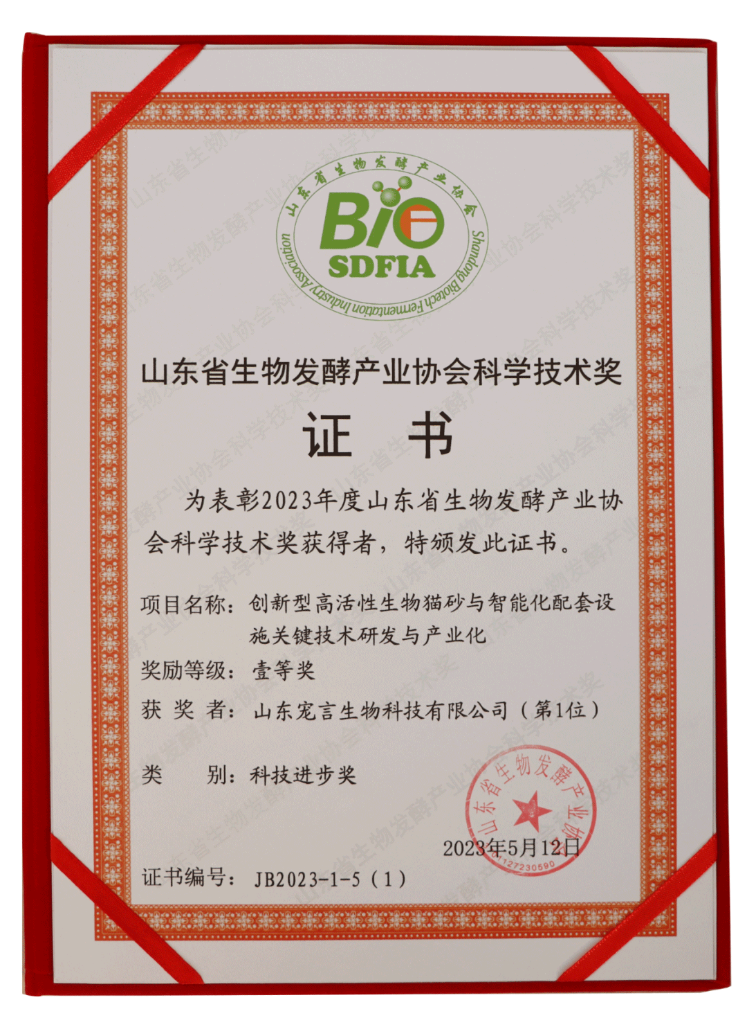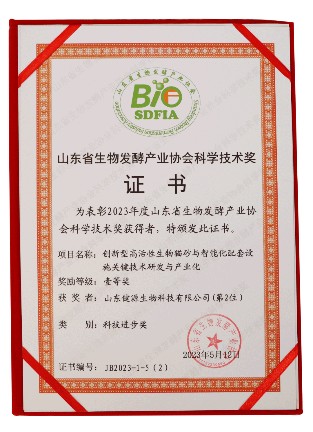 根據《國務院辦公廳關于完善科技成果評價機制的指導意見》(國辦發(2021)26號)要求和《山東省科技廳關于進一步鼓勵和規范山東省社會力量獎設立科學技術獎的指導意見》(魯科字[2018]129號)精神,按照《山東省生物發酵產業協會科學技術獎獎勵章程》相關規定,山東省生物發酵產業協會開展了2023年度山東省生物發酵產業協會科學技術獎的申報、評審工作,經山東省生物發酵產業協會科學技術獎勵委員會評審和審核,山東省生物發酵產業協會批準,授予1項成果為技術發明獎特等獎,授予3項成果為科技進步獎特等獎,授予5項成果為科學技術獎一等獎,授予7項成果為科學技術獎二等級。此次授獎項目共計16項。健源生物及其下屬子公司山東寵言生物科技有限公司《創新型高活性生物貓砂與智能化配套設施關鍵技術研發與產業化》項目榮獲山東省生物發酵產業協會科學技術獎科技進步獎一等獎。