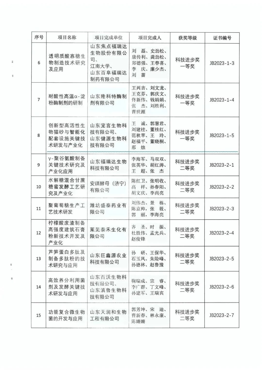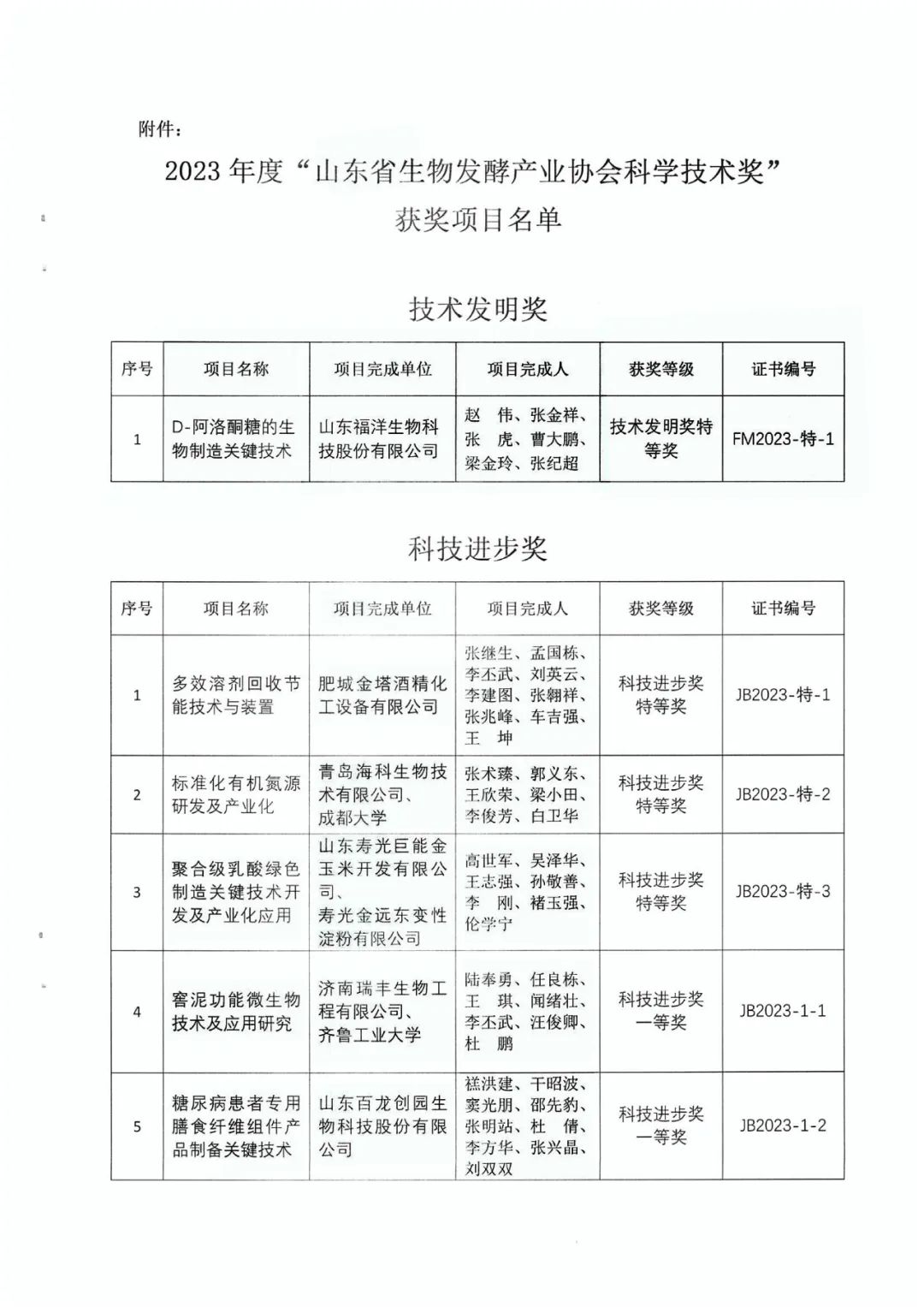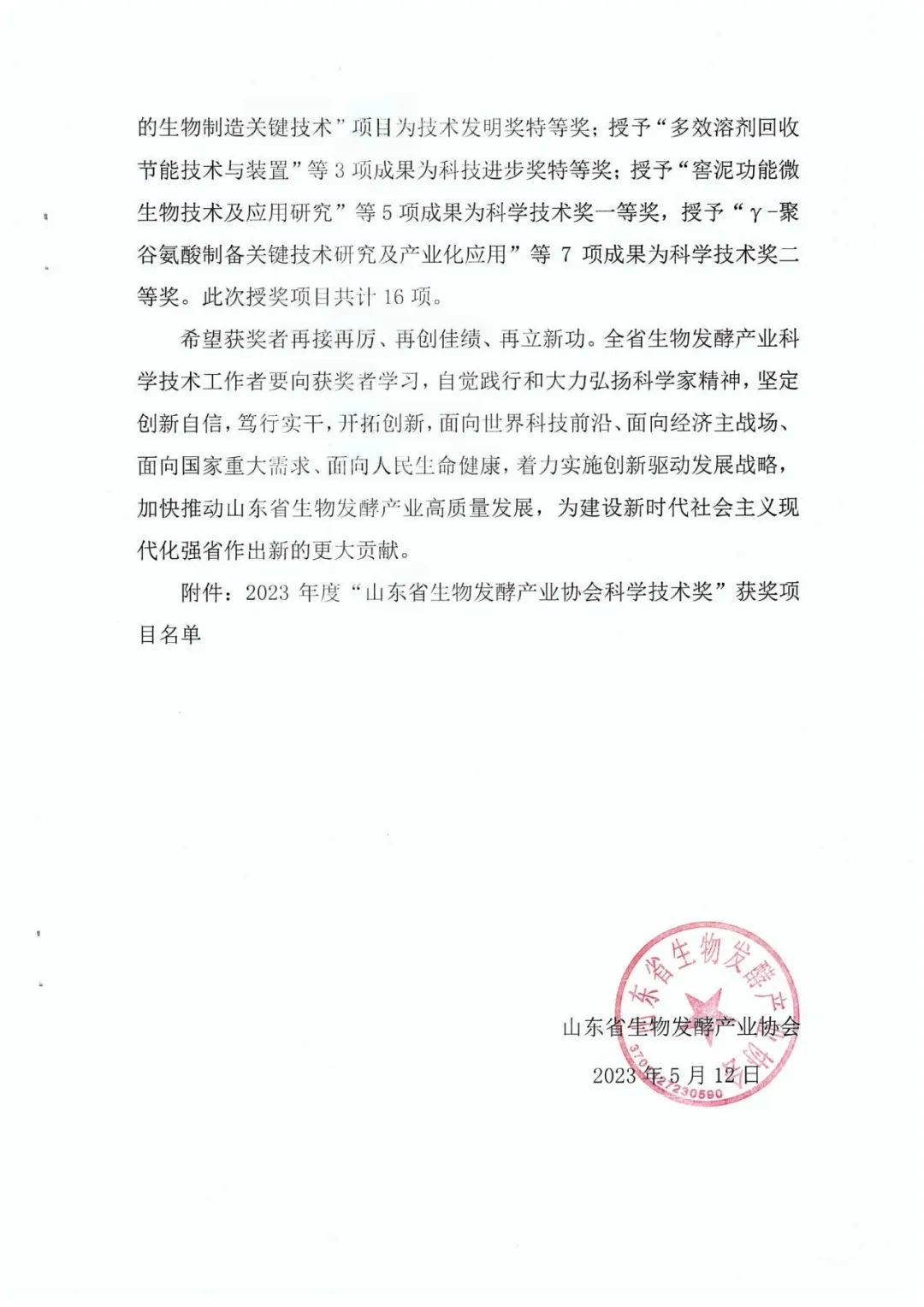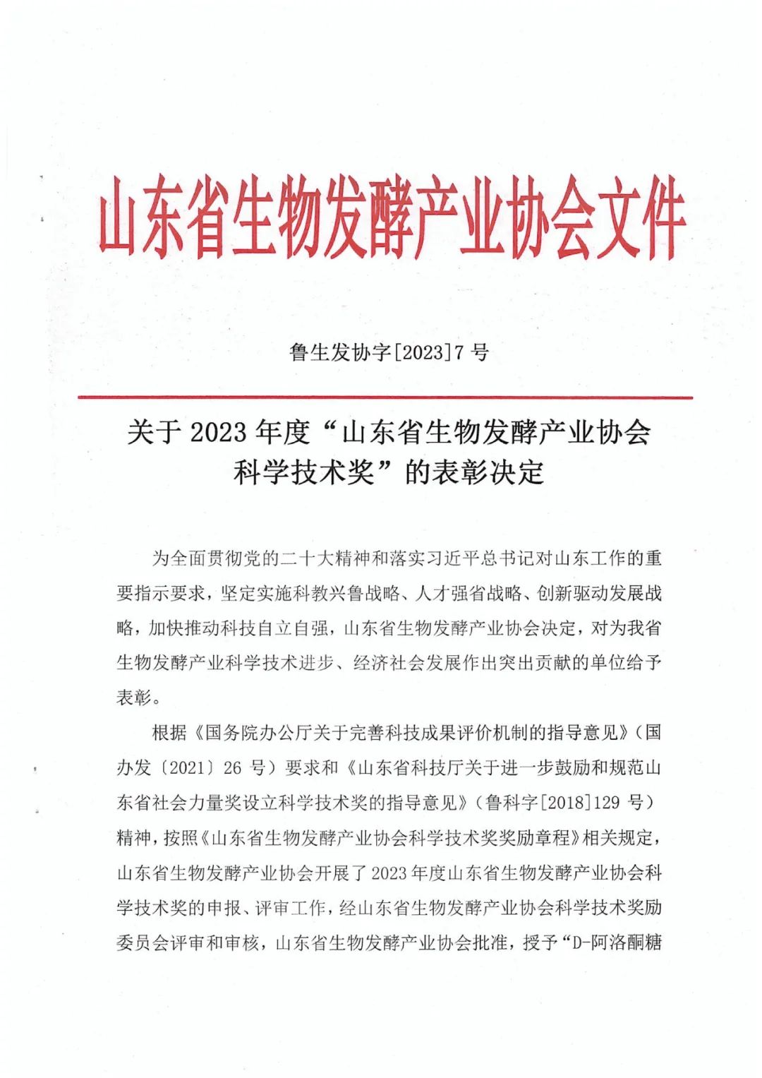山東省生物發酵產業協會科學技術獎科技進步獎一等獎