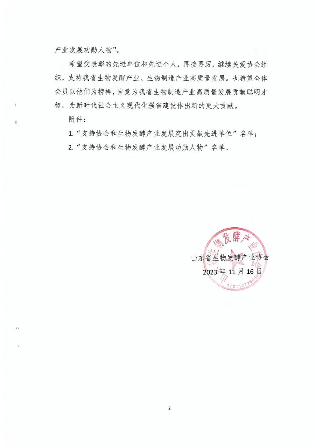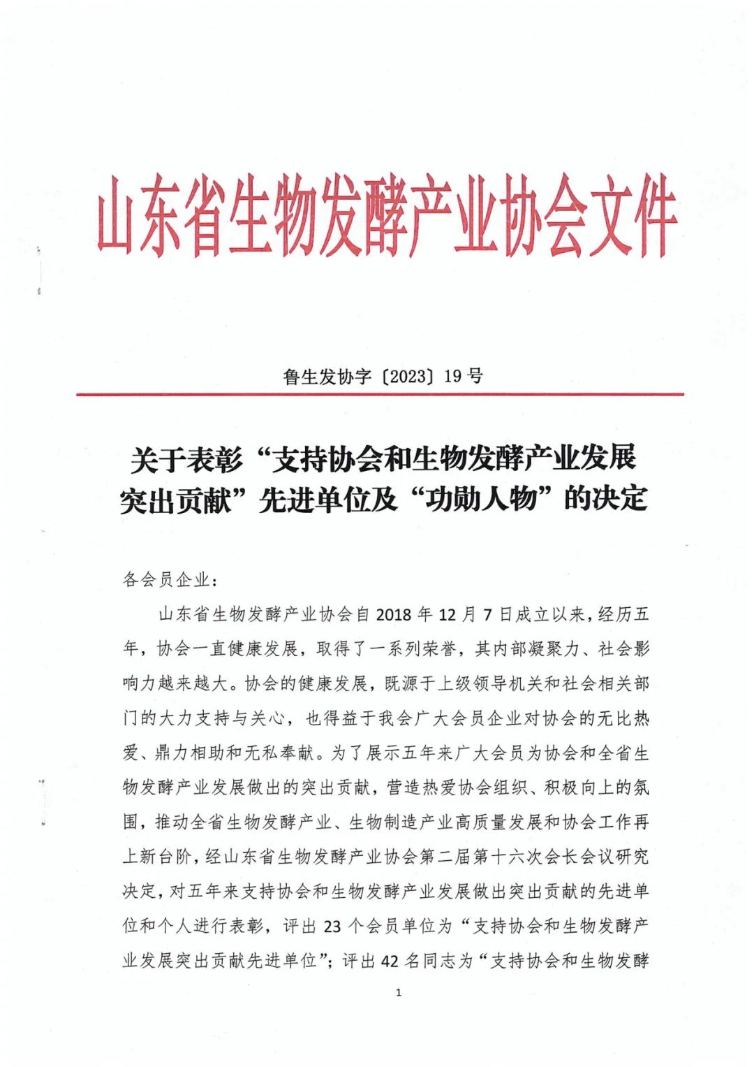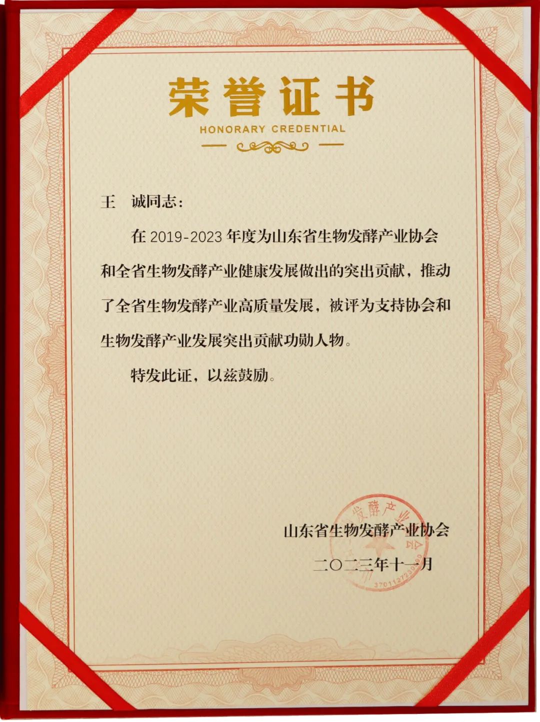 山東省生物發酵產業協會自2018年12月7日成立以來,經歷五年,協會一直健康發展,取得了一系列榮譽,其內部凝聚力、社會影響力越來越大。協會的健康發展,既源于上級領導機關和社會相關部門的大力支持與關心,也得益于我會廣大會員企業對協會的無比熱愛、鼎力相助和無私奉獻。為了展示五年來廣大會員為協會和全省生物發酵產業發展做出的突出貢獻,營造熱愛協會組織、積極向上的氛圍,推動全省生物發酵產業、生物制造產業高質量發展和協會工作再上新臺階,經山東省生物發酵產業協會第二屆第十六次會長會議研究決定,對五年來支持協會和生物發酵產業發展做出突出貢獻的先進單位和個人進行表彰,共評出42名同志為“支持協會和生物發酵產業發展功勛人物”。山東健源生物科技有限公司董事長王誠被評為支持協會和生物發酵產業發展突出貢獻功勛人物。