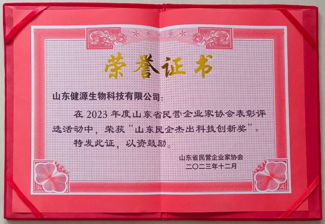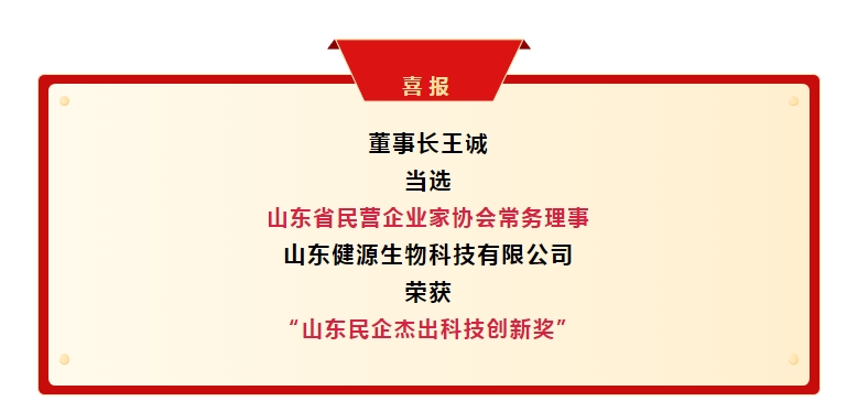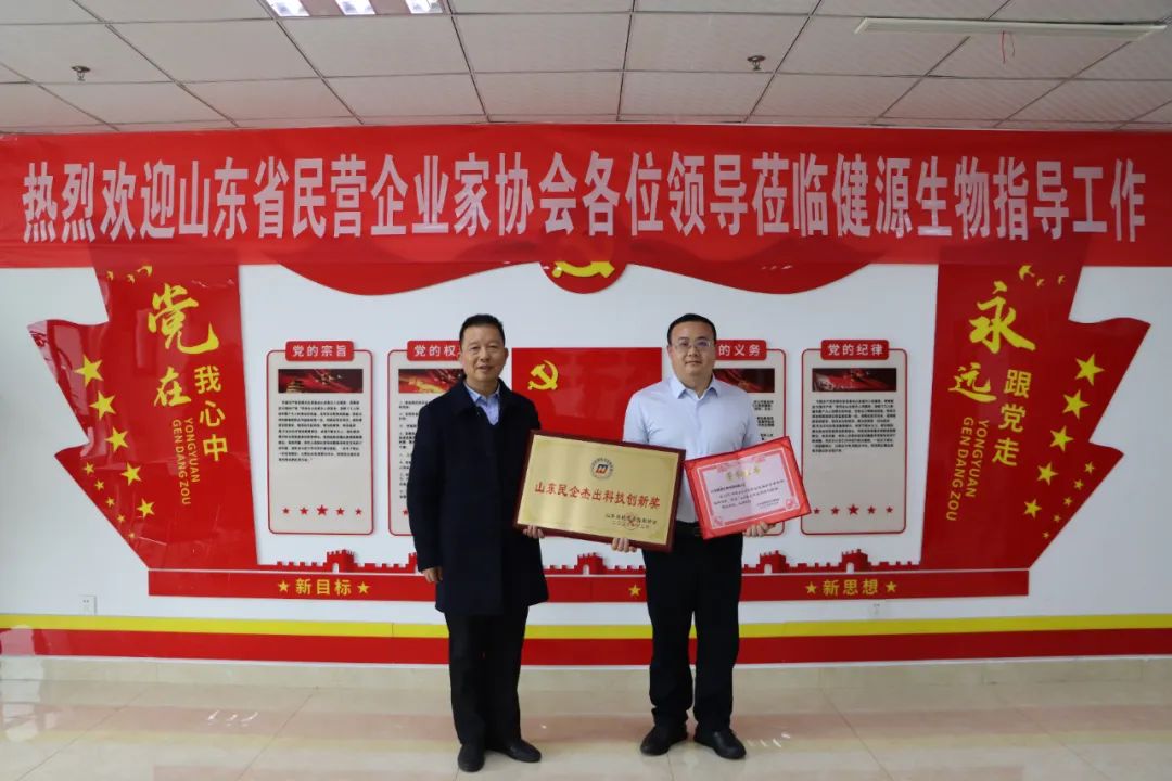 在科技創新的征途上,健源生物再創佳績,榮獲山東省民營企業家協會“山東民企杰出科技創新獎”。