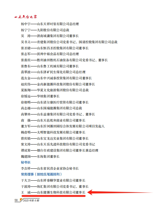 近日,在2023年度山東省民營企業家協會表彰評選活動中,經山東省民營企業家協會三屆十六次會長會議研究,報請協會三屆五次會員代表大會審議,決定增補山東健源生物科技有限公司董事長王誠為山東省民營企業家協會第三屆理事會常務理事。