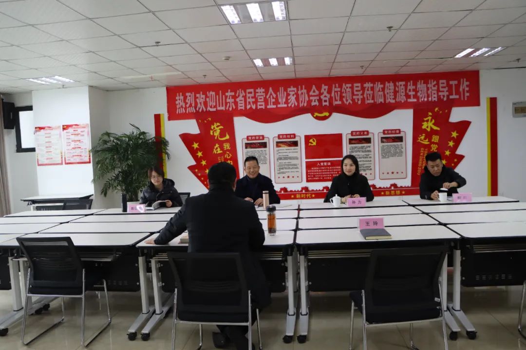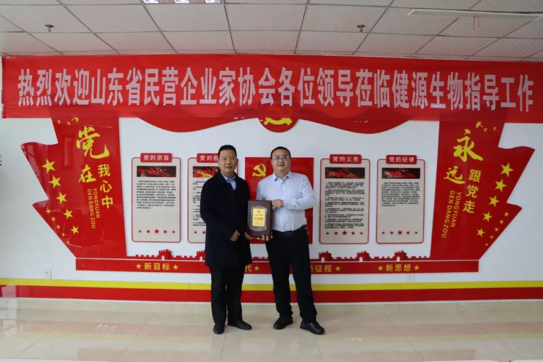 2024年1月17日,山東省民營企業家協會秘書長李吉祥,協會黨支部書記、副秘書長孫力,協會秘書處主任彭亞玲,協會秘書處副主任柳川蒞臨公司調研工作,并為健源生物頒發獎牌和證書。