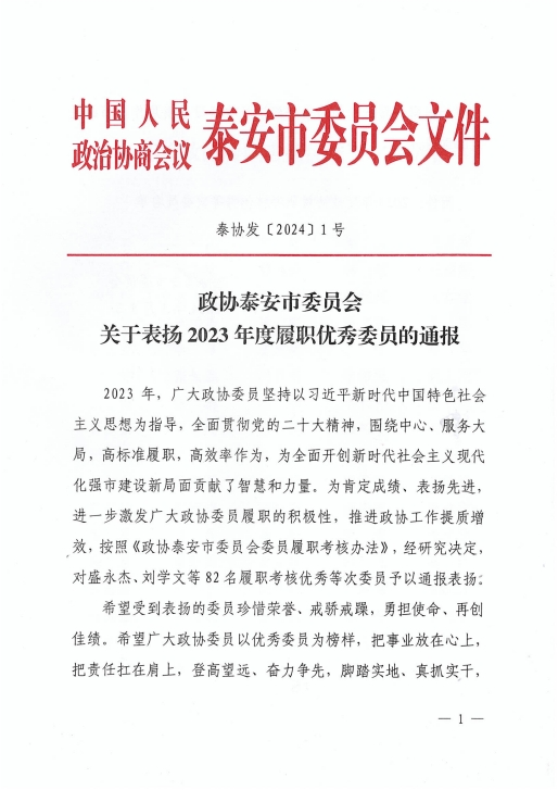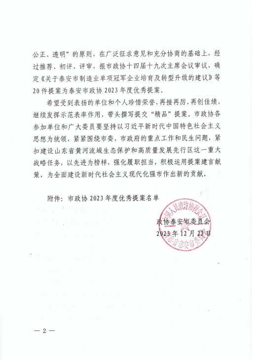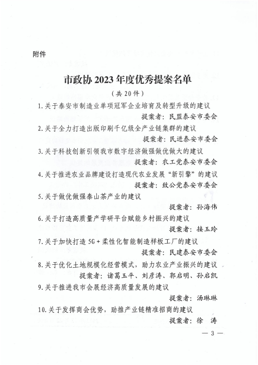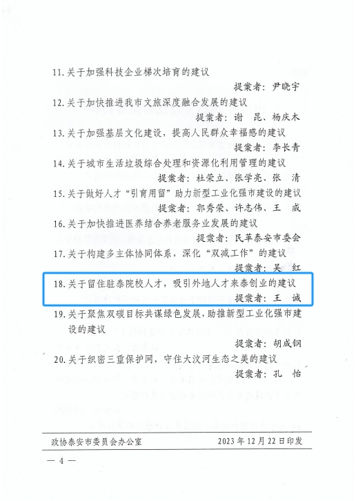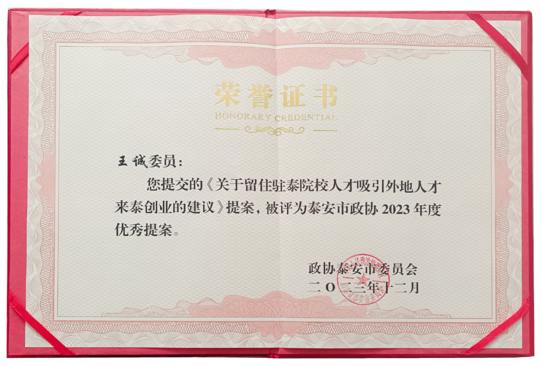 在會上,政協泰安市委員會發布了關于表揚2023年度優秀提案的決定,王誠董事長《關于留住駐泰院校人才,吸引外地人才來泰創業的建議》被選為優秀提案。
