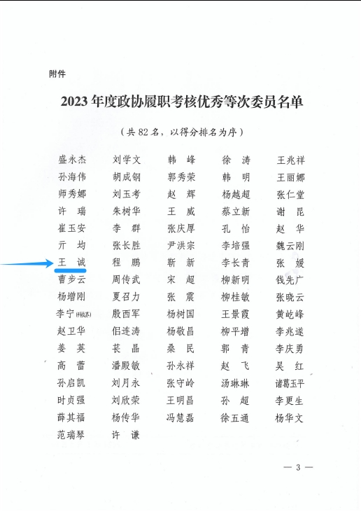 2023年,廣大政協委員堅持以習近平新時代中國特色社會主義思想為指導,全面貫徹黨的二十大精神,圍繞中心、服務大局、高標準履職、高效率作為,為全面開創新時代社會主義現代化強市建設新局面貢獻了智慧和力量。為表揚先進,會上公布了2023年度政協履職考核優秀等次委員名單,董事長王誠光榮上榜!