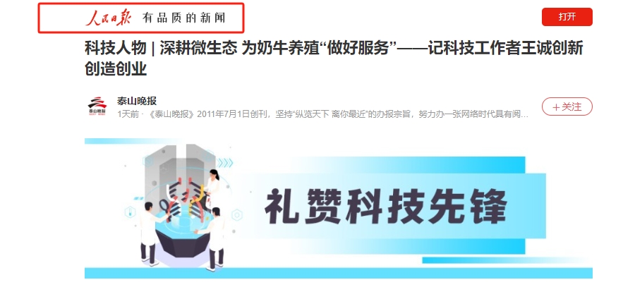 2024年5月30日迎來了第八個全國科技工作者日,山東健源生物科技有限公司董事長王誠作為泰安市科協推選的科技工作者代表接受了泰安日報記者的采訪。《深耕微生態,為奶牛養殖“做好服務”——記科技工作者王誠創新創造創業之路》報道在人民日報、人民號、今日頭條、泰山晚報、最泰安全媒體等多家新聞平臺發布。