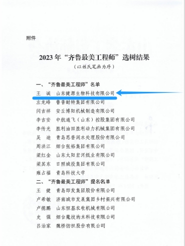 發布時間:[2024-7-5 15:51:56] 瀏覽量:3149次近日,山東省工程師協會下發關于授予2023年度“齊魯最美工程師”榮譽稱號的通報,山東健源生物科技有限公司董事長王誠被授予2023年度“齊魯最美工程師”榮譽稱號。