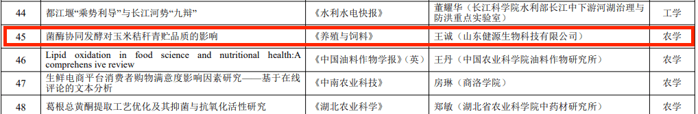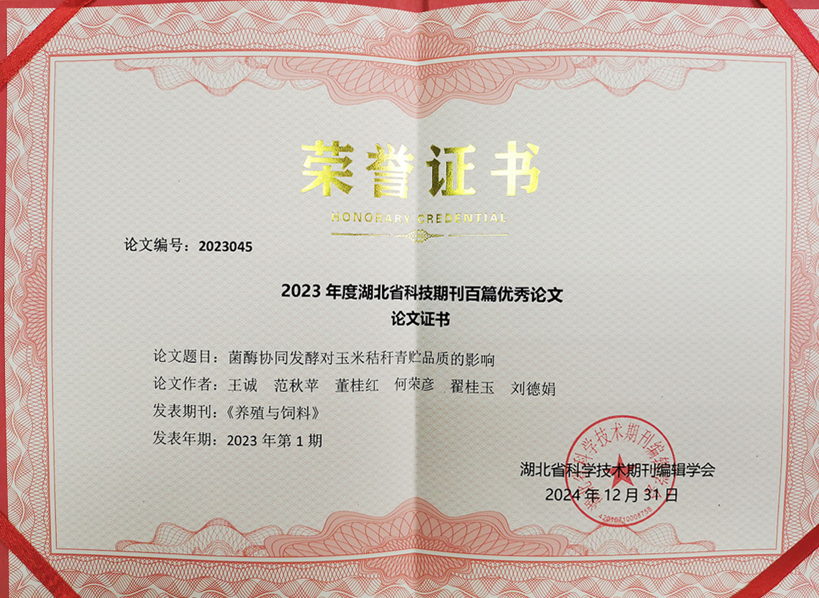發布時間:[2025-1-15 17:6:25] 瀏覽量:2644次2024年12月31日,由湖北省科學技術協會指導,湖北省科學技術期刊編輯學會組織實施的2023年度湖北省科技期刊百篇優秀論文遴選結果公布,經過評選,山東健源生物科技有限公司董事長王誠帶領研發團隊撰寫的《菌酶協同發酵對玉米秸稈青貯品質的影響》論文入選2023年度湖北省科技期刊百篇優秀論文。