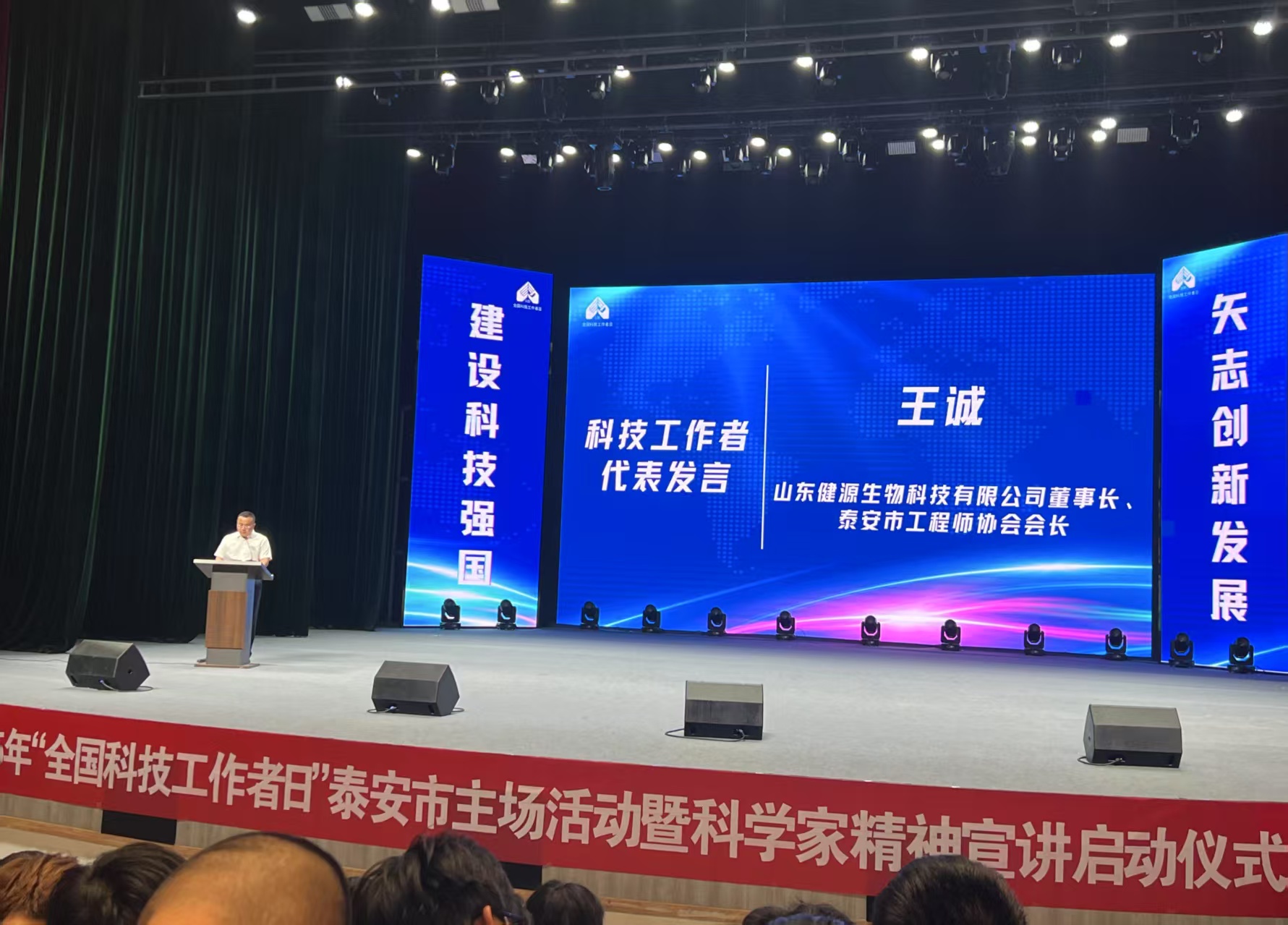 發布時間:[2025-6-2 15:3:40] 瀏覽量:1340次5 月 28 日上午,2025年 “全國科技工作者日” 泰安市主場活動暨科學家精神宣講啟動儀式在泰山科技學院隆重舉行。山東健源生物科技有限公司董事長、泰安市工程師協會會長王誠作為科技工作者代表出席并發言,與400余名科技工作者代表、高校師生齊聚一堂,共慶節日并凝聚科技創新共識。