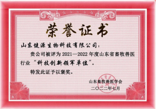 2022-8-1 祝賀山東健源生物被評為2021-2022年度山東省畜牧獸醫行業“科技創新領軍單位”