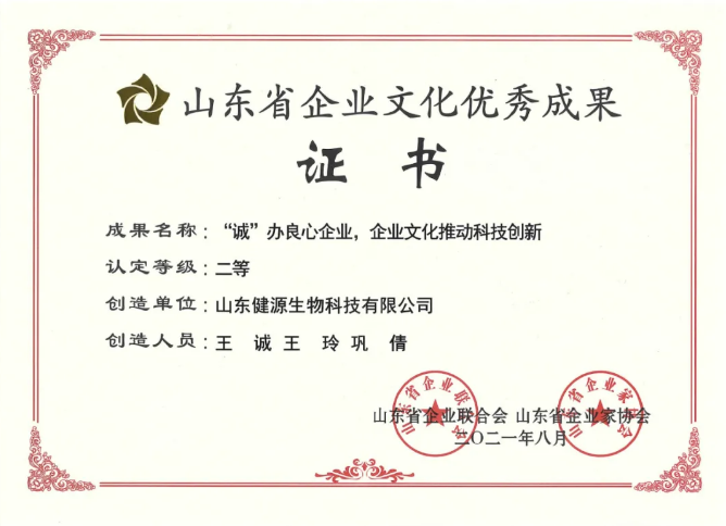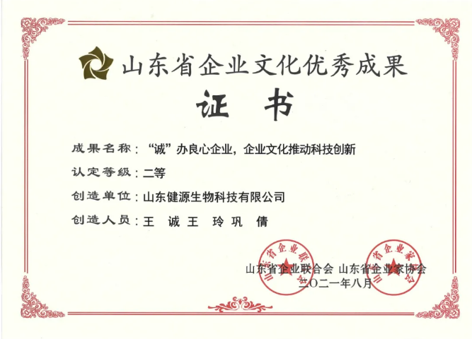 2021-12-20 熱烈祝賀山東健源生物科技有限公司榮獲首屆山東省企業(yè)文化優(yōu)秀成果二等獎