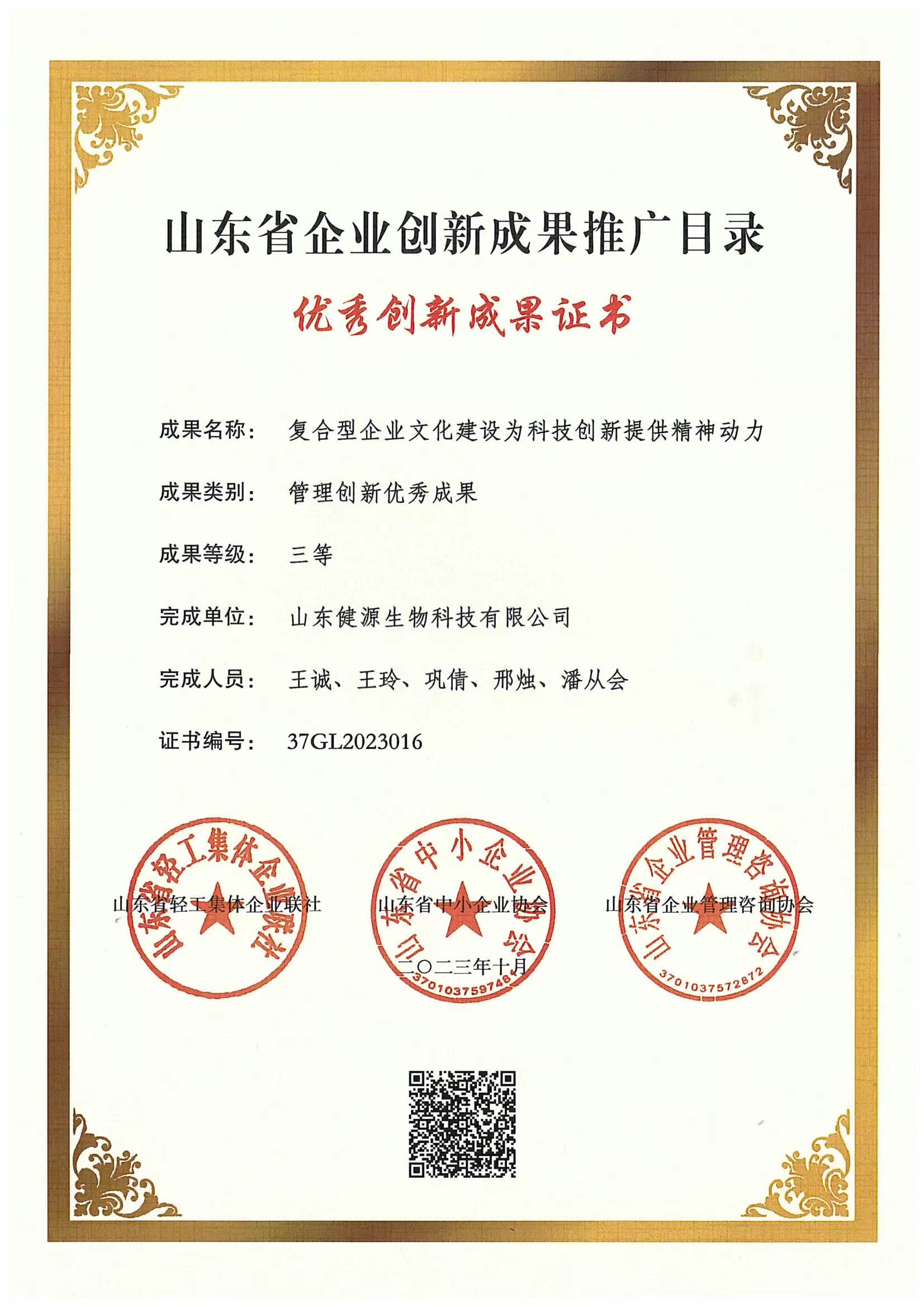 山東健源生物科技有限公司 “復(fù)合型企業(yè)文化建設(shè)為科技創(chuàng)新提供精神動力” 榮獲管理創(chuàng)新優(yōu)秀成果 三等...