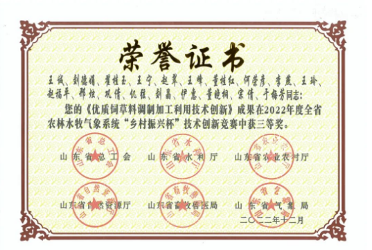 2023-7-15 山東健源生物榮獲2022年度全省農林水牧氣象系統“鄉村振興杯”技術創新競賽三等獎