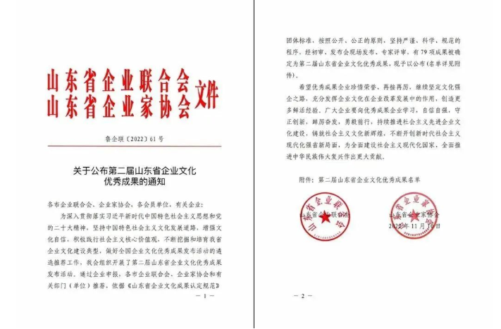 深入貫徹落實習近平新時代中國特色社會主義思想和黨的二十大精神,堅持中國特色社會主義文化發展道路,增強文化自信,積極踐行社會主義核心價值觀,不斷挖掘和培育我省企業文化建設典型,做好全國企業文化優秀成果發布活動的遴選推薦工作。山東省企業聯合會、山東省企業家協會聯合開展了第二屆山東省企業文化優秀成果發布活動。通過企業申報,各市企業聯合會、企業家協會和有關部門(單位)推薦,依據《山東省企業文化成果認定規范》團體標準,按照公開、公正的原則,堅持嚴謹、科學、規范的程序,經初審、發布會現場發布、專家評審,有79項成果被確定為山東省企業文化優秀成果,山東健源生物科技有限公司《“誠”辦良心企業,企業文化推動科技創新》企業文化成果榮獲第二屆山東省企業文化優秀成果二等獎。