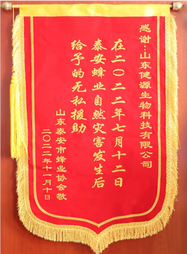 2023年4月11日,山東健源生物科技有限公司收到來自山東泰安市蜂業(yè)協(xié)會(huì)的一封感謝信和一面錦旗,感謝山東健源生物在2022年7月12日,泰安蜂業(yè)自然災(zāi)害發(fā)生后,給予的無私援助。