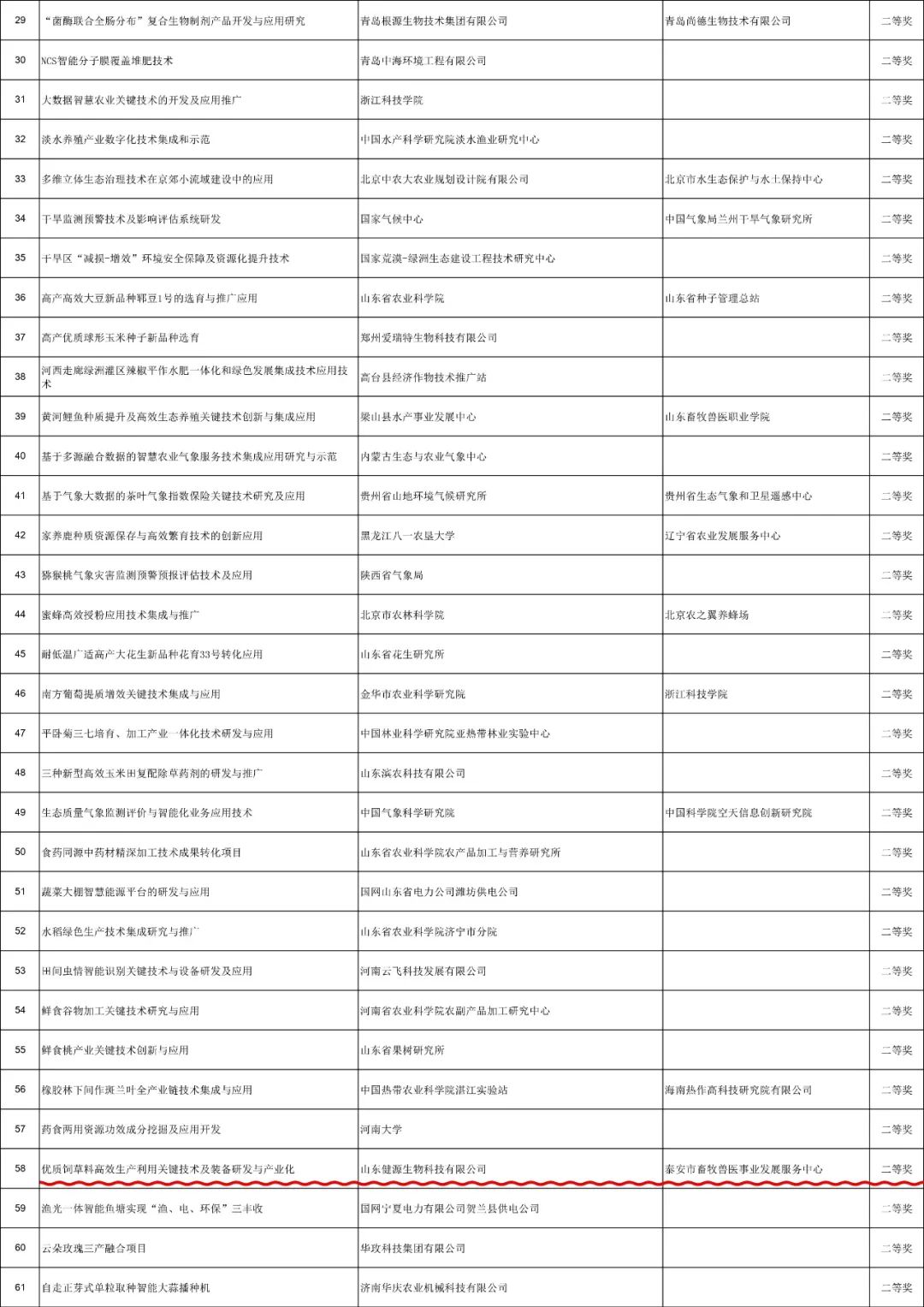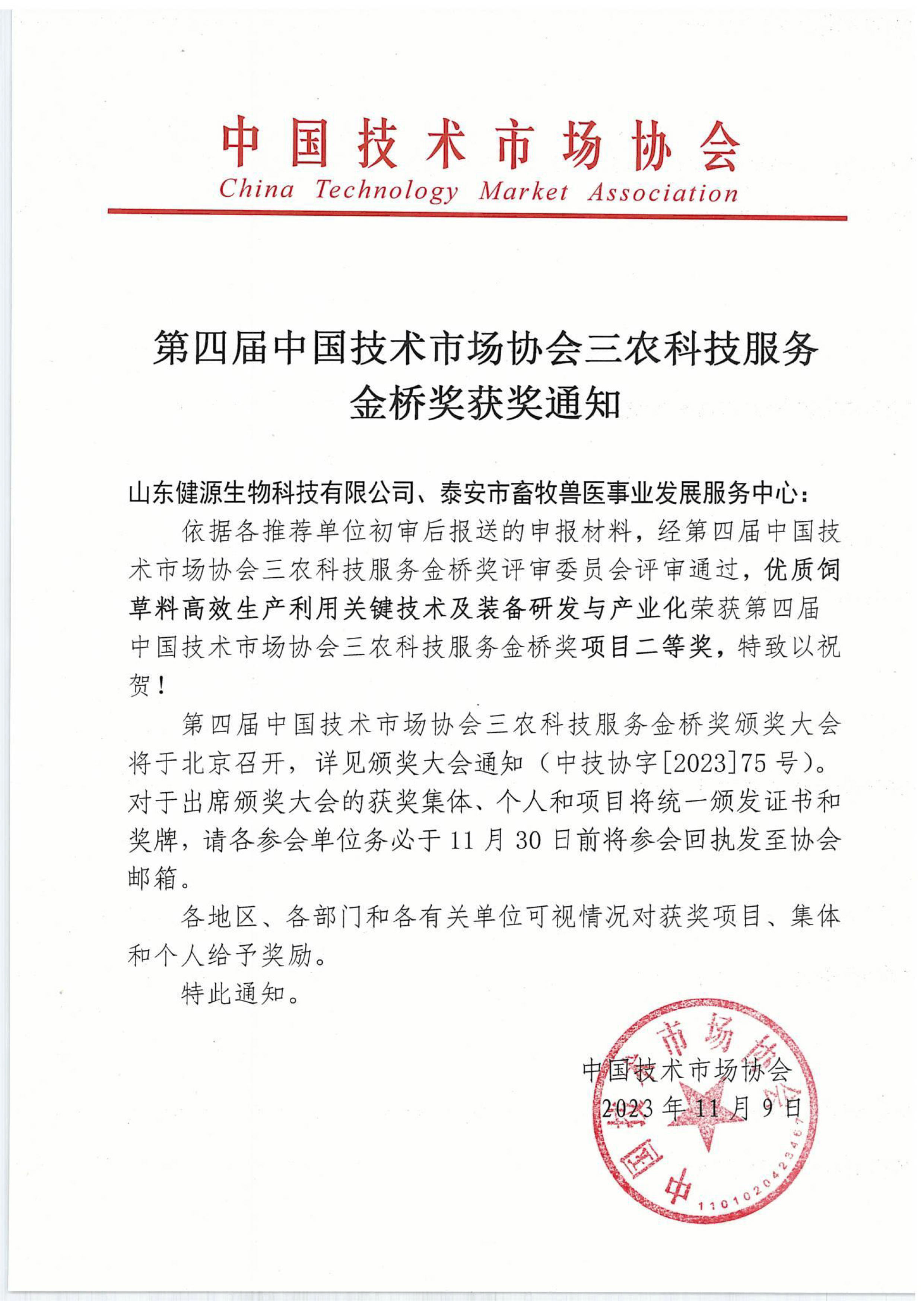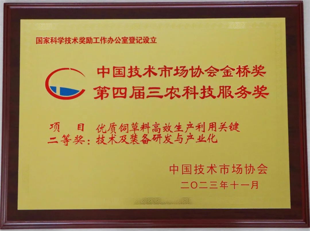 山東健源生物科技有限公司《優質飼草料高效生產利用關鍵技術及裝備研發與產業化》項目榮獲中國技術市場協會金橋獎第四屆三農科技服務獎項目二等獎。