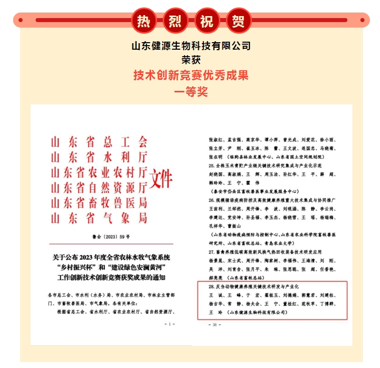 近日,山東省總工會、省水利廳、省農(nóng)業(yè)農(nóng)村廳、省自然資源廳、省畜牧獸醫(yī)局、省氣象局發(fā)布了2023年度全省農(nóng)林水牧氣象系統(tǒng)“鄉(xiāng)村振興杯”和“建設(shè)綠色安瀾黃河”工作創(chuàng)新技術(shù)創(chuàng)新競賽獲獎成果,山東健源生物科技有限公司的《反芻動物健康養(yǎng)殖關(guān)鍵技術(shù)研發(fā)與產(chǎn)業(yè)化》項目榮獲技術(shù)創(chuàng)新競賽優(yōu)秀成果一等獎。