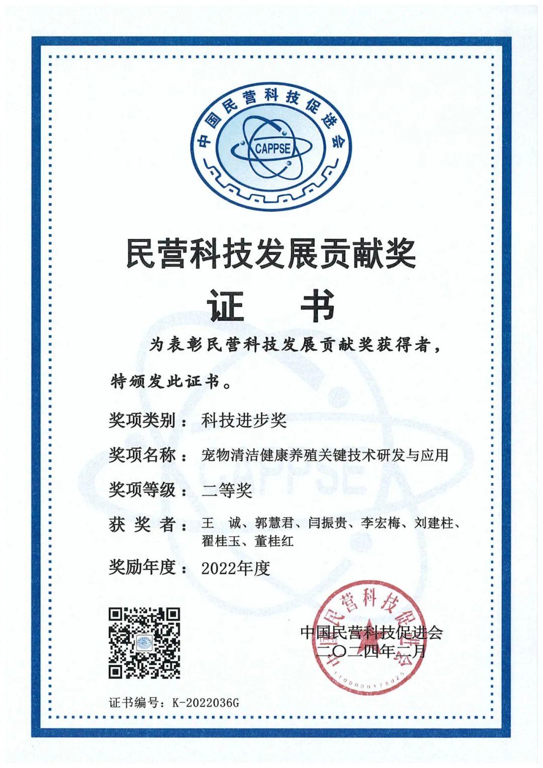 山東健源生物科技有限公司及旗下山東寵言生物科技有限公司聯合山東農業大學共同完成的“寵物清潔健康養殖關鍵技術研發與應用”項目榮獲“2022年度民營科技發展貢獻獎科技進步獎二等獎”。